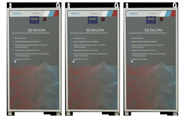 Комплекты трехфазные серии SQ-DeLUXe Серия стабилизаторов это электронно-цифровые стабилизаторы напряжения премиум класса. Трёхфазный комплект состоит из трёх однофазных стабилизаторов одноимённой серии, соединяемых по схеме . Благодаря исключительно плавной регулировке, качество выходного напряжения в стабилизаторах сравнимо с сервоприводными типами стабилизаторов, а быстродействие и бесшумность вне всякой конкуренции. Серия стабилизаторов предназначена для питания систем энергоснабжения загородных домов, измерительного и сложного медицинского оборудования, специального промышленного оборудования (оборудование для лазерной резки и обработки металлов, сварочное оборудование и т.п.). Стабилизаторы серии это: - 120 ступеней стабилизации напряжения; - повышенная точность стабилизации 0,5%; - встроенный интерфейс с портом RS232 c возможностью дистанционного контроля и управления стабилизатором; - автоматический встроенный байпас; - яркий дисплей с понятным интерфейсом; - быстродействующая мультиэлектронная защита от короткого замыкания (не более 10 мс); - постоянный контроль тока нагрузки, входного и выходного напряжения; - прочный и надежный металлический корпус с дверцей для удобства подключения к сети и нагрузке; - режим работы без ограничений мощности нагрузки во всем диапазоне входного напряжения. Мощностной ряд серии включает в себя трёхфазные комплекты на основе однофазных моделей мощностью от 45 кВА (3х15 кВА) до 150 кВА (3х50 кВА). В стабилизаторах этой серии регулирование напряжения осуществляется за счет ступенчатого переключения по двоичному цифровому коду последовательно соединенных с помощью силовых ключей вольтодобавочных секций обмоток регулирующего трансформатора. Такое схемотехническое решение позволило предложить рынку ступенчатый стабилизатор с исключительно плавной регулировкой выходного напряжения дискретность регулирования составляет 0,6 В. Для обеспечения вывода информации о работе стабилизатора и изменения регулируемых параметров все однофазные блоки стабилизатора имеют цифровой светодиодный дисплей с 2-х кнопочной клавиатурой. Клавиатура дисплея позволяет вывести на экран информацию о величине входного и выходного фазного напряжения стабилизатора, о мощности подключенной к стабилизатору нагрузки. С помощью клавиатуры производится также установка требуемого выходного фазного напряжения (в диапазоне 210 В 230 В с дискретностью 1 В) и точности регулирования. Стабилизаторы разработаны и серийно выпускаются в соответствии с ТУ 27.11.50-001-28900165-2020. Конструктивно стабилизаторы выполнены в металлическом корпусе напольного исполнения с вентиляционными отверстиями. Встраиваемые в системы электроснабжения промышленных и жилых зданий стабилизаторы серии , как наиболее высокоточные, дают хороший энергосберегающий эффект, так как оборудование, работающее при номинальном напряжении, потребляет на 10-30% меньше электроэнергии, чем при работе в условиях повышенного, либо напряжения.